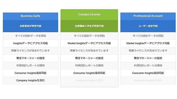 ご利用用途に合わせて選べるアカウント種別 - 大学および教育機関の学部単位からキャンパス全体、また単科大学全体にアクセス権が付与されるCampus License。その他に、人数を指定したProfessional Accountや、様々なInsightsを組み合わせてご利用いただけるBusiness Suiteもご用意しております。