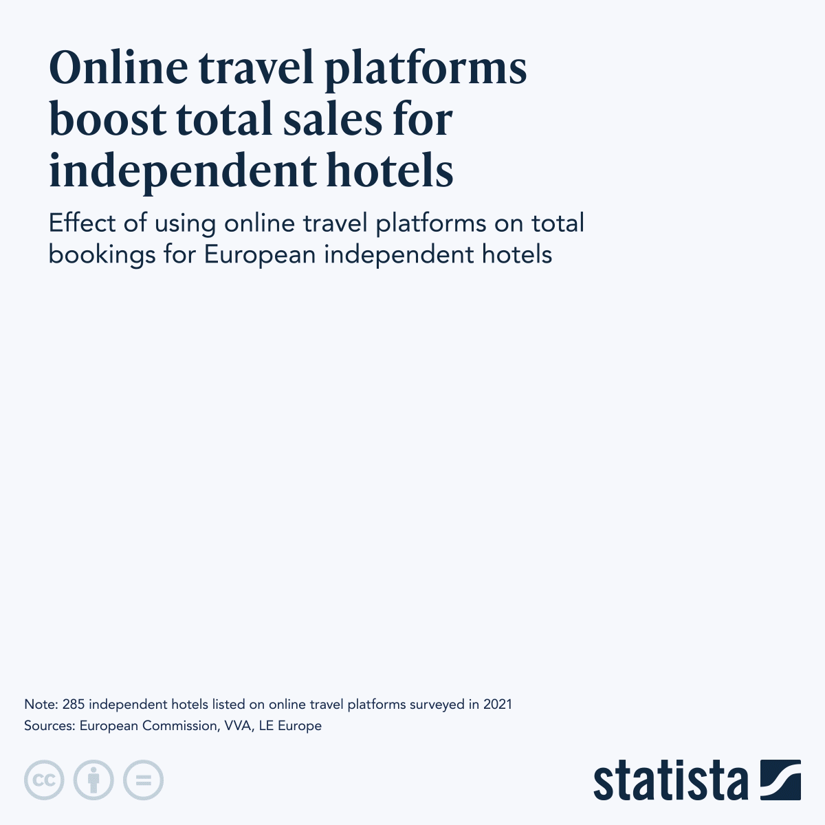 As more and more consumers continue to turn to online travel platforms to plan their travels, the services have become crucial for independent hotels. For these smaller businesses, online travel platforms serve both as a marketing tool, as well as a means of gaining visibility amongst the major hotel chains. In a 2021 survey of independent hotels in Europe, a total of 80 percent of respondents surveyed indicated that online travel platforms like Expedia, Booking.com, Airbnb, Trip.com, etc. increased the overall amount of bookings they received. Only a minority of the independent hoteliers surveyed (15%) did not see any effect on their business, while just under 5 percent believed that online travel platforms reduced their total bookings.