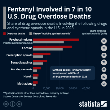 Out of the roughly 108,000 registered cases of deaths by overdose in 2022, almost 74,000 were directly related to synthetic opioids, the most prevalent of which is fentanyl. The drug is said to be 50 times more potent than heroin and is easy and cheap to manufacture since it's not tied to a crop base like more traditional opioids like heroin. The picture gets even more dire in the age bracket of 15 to 24. Here, 81 percent of the 6,696 overdose deaths can be ascribed to synthetic opioids, with the connected cases increasing fivefold between 2015 and 2022.