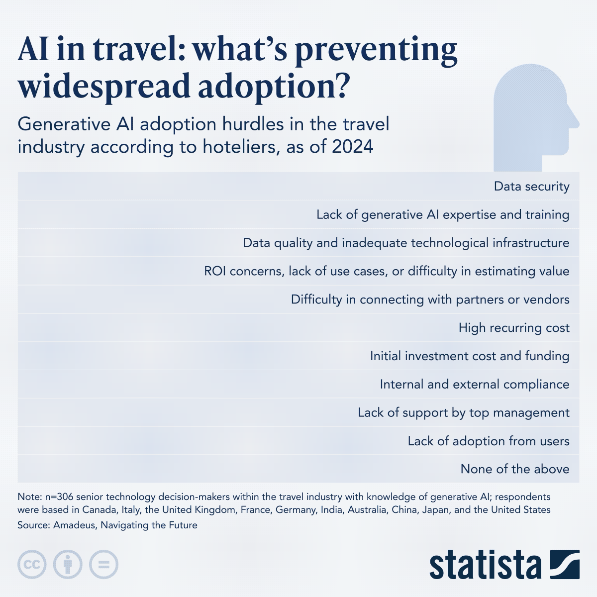 But despite the rapid pace of innovation, not everything is smooth sailing. Generative AI faces some serious turbulence on the runway to widespread adoption. The Amadeus report – Navigating the Future – revealed that data protection is a top concern for travel industry professionals when it comes to adopting AI technologies. And understandably so. AI systems are trained on vast datasets, many of which may contain sensitive personal information. This goes hand in hand with the second most common challenge nominated by 34% of the respondents, a lack of expertise and training.