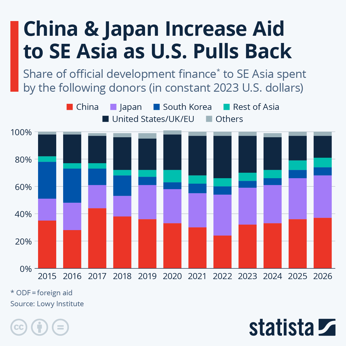 China and Japan are becoming increasingly important foreign aid donors to Southeast Asia as the United States, European Union and United Kingdom have all made cutbacks in aid to the region. Analysts at the Lowy Institute say that the aid cuts will deepen the development divide, with poorer countries and the social sectors of health, education and civil society most affected. Official Development Finance (ODF) includes traditional aid, such as grants and concessional loans (ODA), as well as other official flows (OOF) from foreign governments and multilateral bodies.