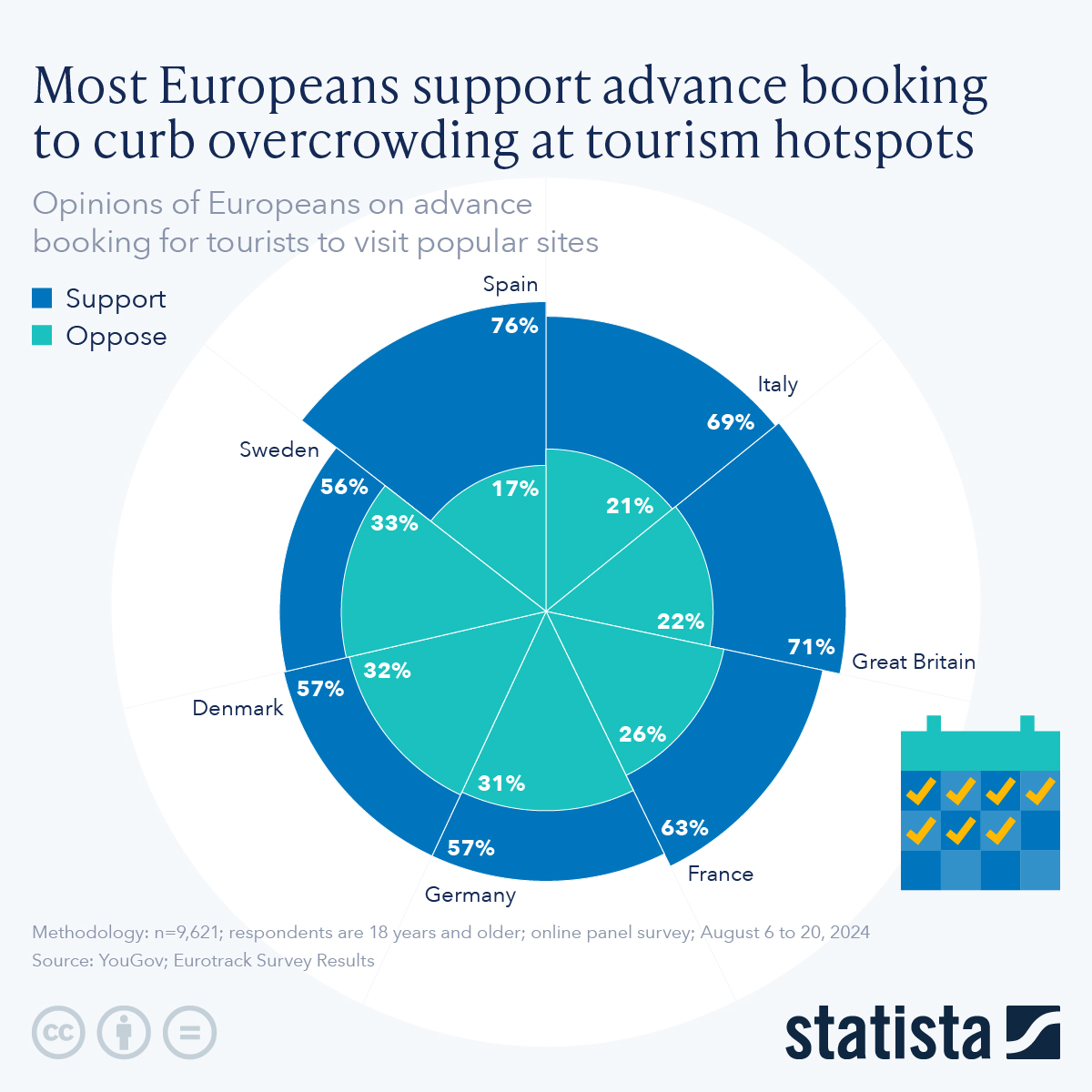 In an online YouGov survey on European attitudes to overtourism, 76% of Spanish respondents indicated that they support tourists being required to book in advance in order to access popular sites. A similar sentiment was also expressed by 71% of British respondents, but in Sweden, Germany, and Denmark almost a third of respondents were opposed to the idea.