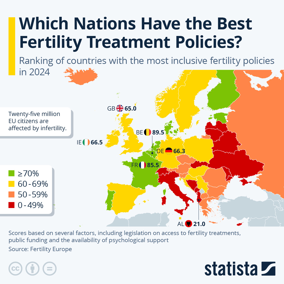 Recent data from Fertility Europe, released in 2024, reveal significant disparities in access to assisted reproduction across the continent. Belgium and the Netherlands rank highest, with a range of strong inclusive fertility policies, scoring above 89 percent. Towards the other end of the spectrum is Albania, where reproductive inclusivity reaches a score of just 21.9 percent.