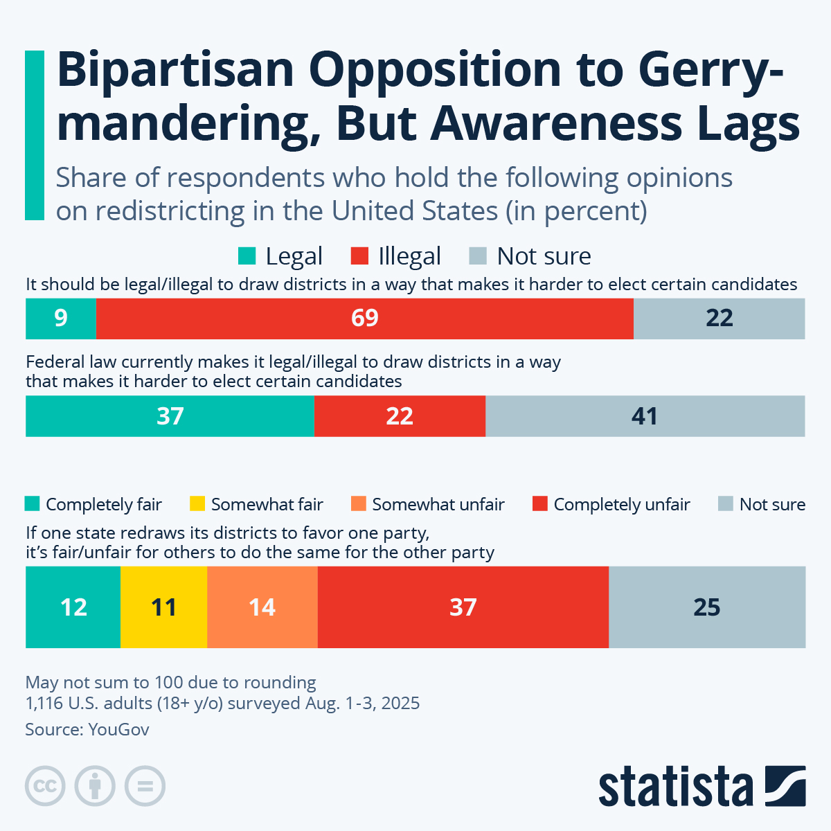 Less than one in four U.S. adults agreed with the idea that if one state redraws its districts to favor one party, other states should be able to do the same for the other party. By contrast, 51 percent said they thought it was unfair and another quarter (25 percent) said they were not sure.