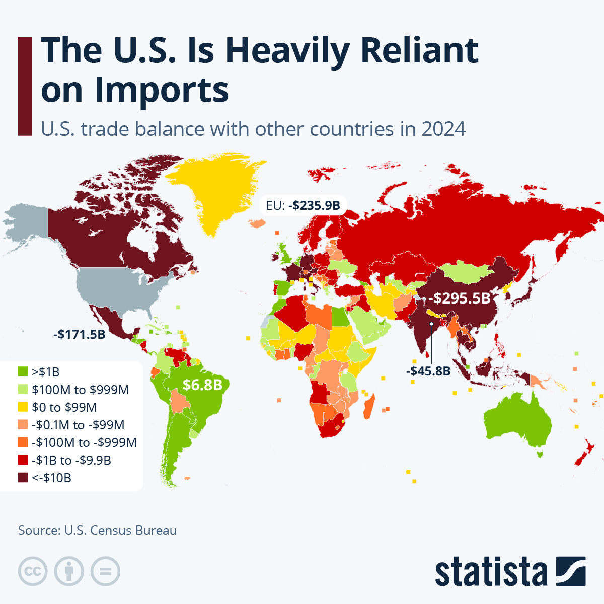 According to U.S. Census Bureau data, the U.S. had a global trade deficit in 2024 of $1.44 trillion. The countries with whom the U.S. had the largest trade deficits with last year were China ($-295.5 billion), Mexico ($-171.5 billion), Vietnam (-$123.5 billion), Ireland (-86.5 billion) and Germany ($-84.7 billion). As a group, the European Union was in second place after China ($-235.9 billion). This means the U.S. imported more goods from these economies in 2024 than it exported to them.