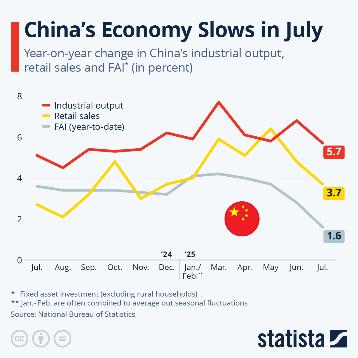 China’s economy showed signs of slowing in July, according to new data released on Friday by the National Bureau of Statistics. Growth declined across several economic indicators, including industrial output, retail sales and fixed asset investment (excluding rural households).