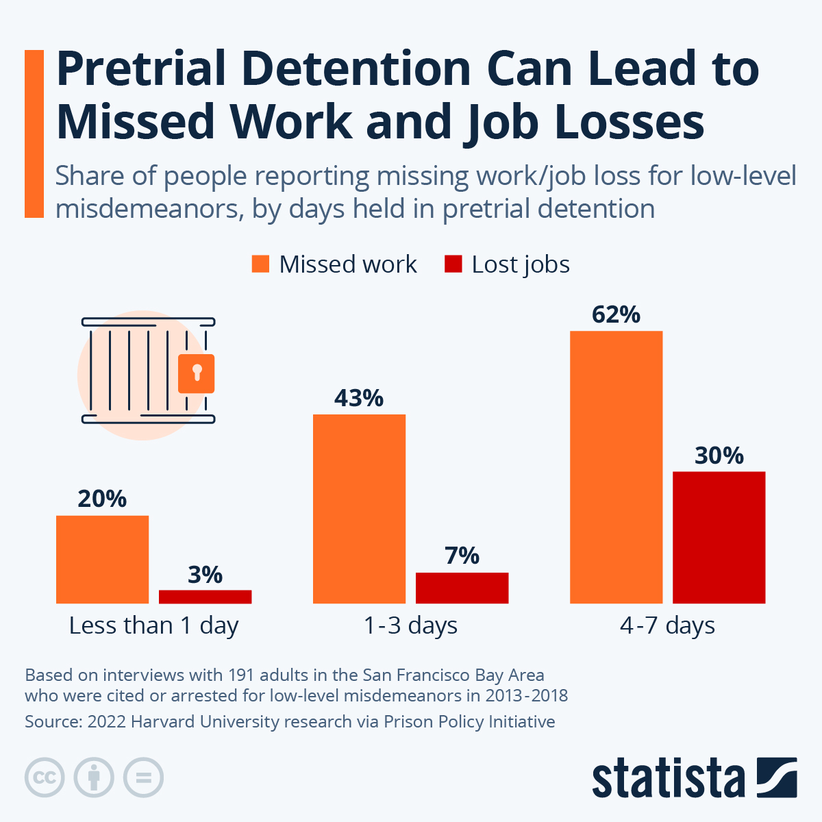 Harvard University research published in 2022 shows that being held in pretrial detention can lead to time off work and the knock-on effect of job losses. Out of 191 adults who were cited or arrested for low-level misdemeanors in the San Francisco Bay Area in 2013-2018, 20 percent missed work when they were in pretrial detention for less than one day. This rose to 43 percent when they were in for one to three days and 62 percent for those in pretrial detention for four days to one week. Where seven percent of respondents said they lost their jobs after being in pretrial detention for one to three days, that jumped to 30 percent who lost their jobs after being in pretrial detention for four to seven days.