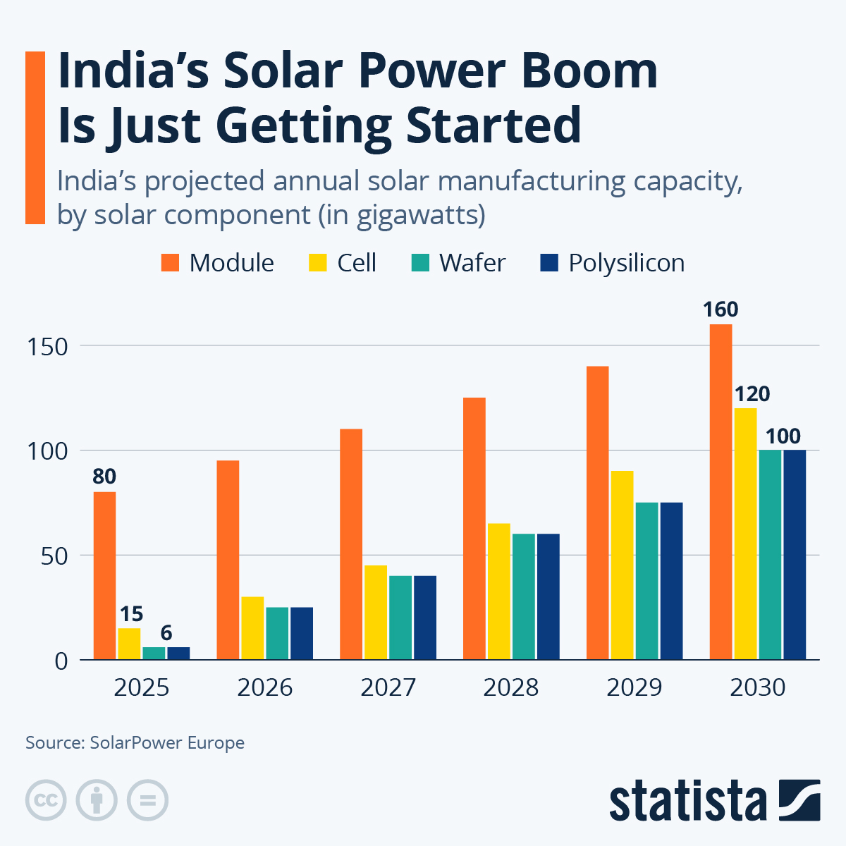 India’s increasing energy demand, driven by rapid industrialization, urbanization and its commitment to achieving net zero emissions by 2070, is fuelling a solar power manufacturing boom. According to estimates by SolarPower Europe, the country’s photovoltaic module manufacturing capacity is set to increase from 80 gigawatts in 2025 to 160 GW by 2030.