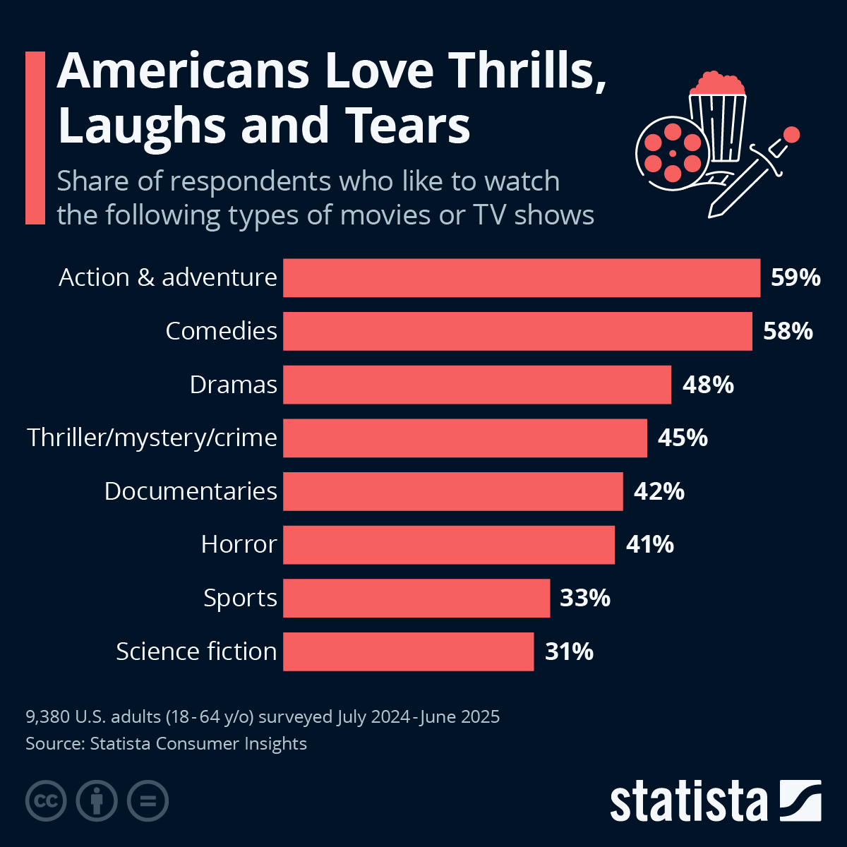 Americans’ entertainment preferences reveal a strong appetite for action, humor and heartfelt storytelling. According to a Statista Consumer Insights survey, action and adventure films lead the way, with 59 percent of U.S. adults saying they enjoy the genre. Just behind, 58 percent of respondents favor comedies, highlighting the appeal of laughter and lighthearted escapism. Meanwhile, dramas captivate 48 percent of viewers, rounding out the top three choices.