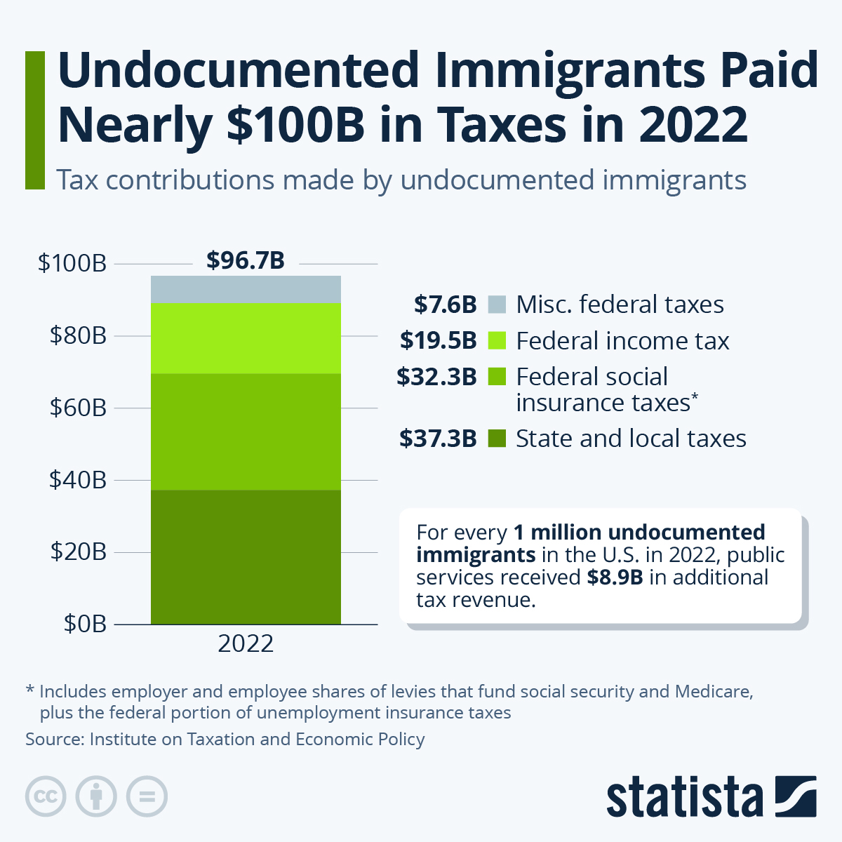 Undocumented immigrants paid $96.7 billion in federal, state and local taxes in 2022, according to an analysis by the Institute on Taxation and Economic Policy. This equated to roughly $8,889 per person that year, or $8.9 billion in additional tax revenue for every one million undocumented migrants living in the country.