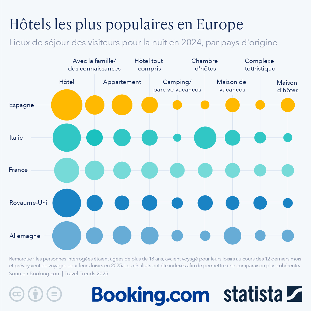 Dans le rapport « Travel Trends 2025 » de Booking.com, les hôtels restent le premier choix d'hébergement dans les principales économies européennes, mais les préférences en matière de deuxième choix varient selon les régions. Les chambres d'hôtes sont particulièrement populaires auprès des voyageurs italiens ; les voyageurs espagnols sont plus susceptibles de séjourner dans un appartement que les autres nationalités ; et les Français pourraient être enclins à séjourner en famille s'ils ne séjournent pas à l'hôtel.