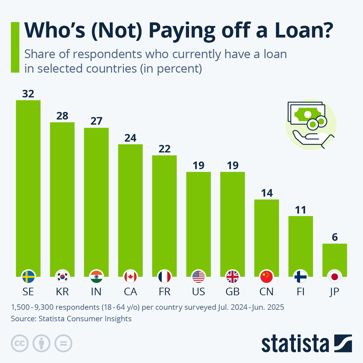 A new survey by Statista Consumer Insights found that around one in five adults in the United States is currently paying off a loan. This puts the U.S. near the median of the surveyed countries, with Sweden at the higher end as 32 percent of respondents reported having outstanding loans while Japan ranked lowest at just six percent. The survey was conducted among adults aged 18 to 64 years old across 21 countries between July 2024 and June 2025.