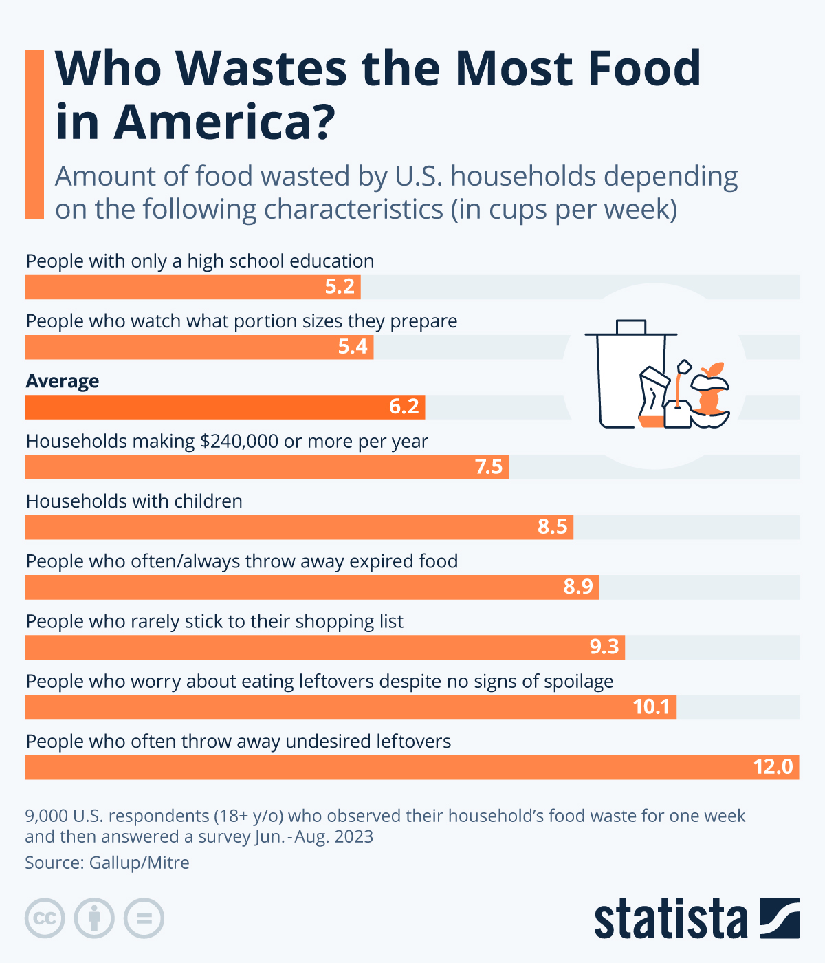 More important to the amount of food waste a household produced was its relationship with leftovers, however, as those rejecting leftovers and those sceptical of their edibility wasted up to twice as much food as the U.S. average. Rarely sticking to a shopping list as well as discarding all expired foods without checking resulted in around 50 percent more food waste on the household level.