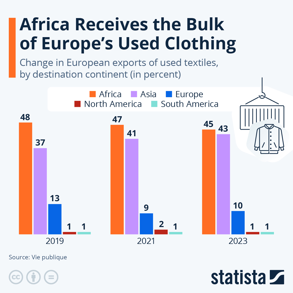 Data from Vie publique reveals that nearly half of the textiles exported by Europe each year are sent to Africa. While there is demand for affordable secondhand clothing on the continent, the notion that these textile donations are charitable gifts to those in need does not reflect reality.