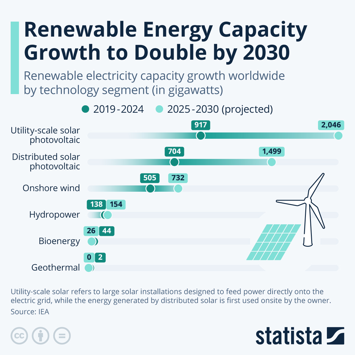 Growth in both utility-scale solar photovoltaic energy (produced by large solar installations designed to feed power directly onto the electric grid) and distributed solar photovoltaic energy (where the energy generated is first used onsite by the owner, and only the excess energy is sent to the grid) is expected to double, and these two segments should represent close to 80 percent of the global renewable energy capacity expansion by 2030. Compared to 2019-2024, onshore wind capacity additions should also expand by around 45 percent, with important progress being made in Africa, the Middle East, ASEAN countries, Latin America, Europe and Asia.
