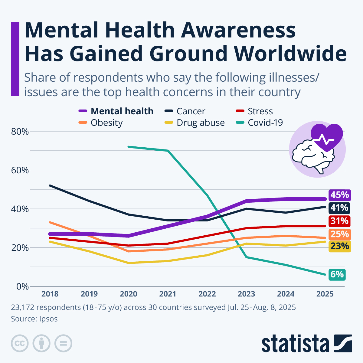 Mental health remains the top health concern globally, ranking above cancer, obesity and heart disease. This is according to a new Ipsos survey, conducted between July 25 and August 8, 2025, across 30 countries.
