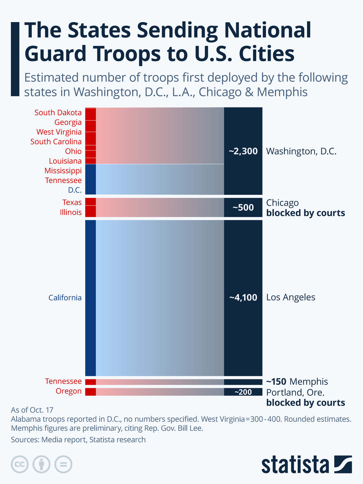 Alongside Washington D.C. and Los Angeles, this now brings the number of U.S. cities with National Guard troops on their streets to three. Meanwhile, judges have blocked U.S. President Donald Trump’s plans to send troops to Portland, Oregon and Chicago. Trump argues that the patrols are needed to combat crime, support immigration agents and protect federal property, but critics warn that the pattern of these deployments combined with the increase in federal immigration raids and operations has "blurred the lines" between traditional law enforcement, immigration enforcement and the role of the National Guard.