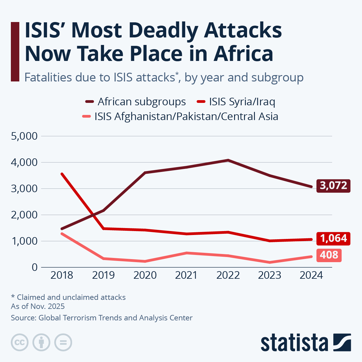 Data by the Global Terrorism Trends and Analysis Center accessed in November 2025 shows that the ISIS subgroups Greater Sahara, Western Africa, DRC, Somalia and Mozambique claimed the lives of more than 3,000 people last year. This is a stark increase from just around 600 in 2018. Northern African groups were less active in 2024, but had killed as many 800 in 2018.