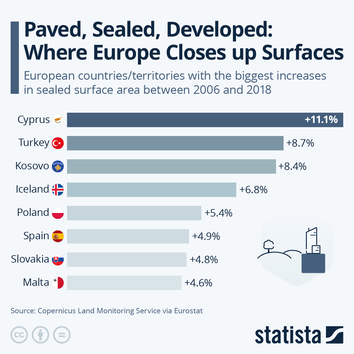 Data from Copernicus published by Eurostat shows where the sealing of natural surfaces in Europe has been moving fastest. Countries that have been defined by large rural or wilderness stretches as well as very small nations are seeing the biggest relative growth in their sealed surfaces. Between 2006 and 2018, the latest data available, this applied to Cyprus, Turkey, Kosovo, Iceland and Poland. In the island nation of Cyprus, sealed area increased by a whopping 11 percent over the course of the given 12 years.