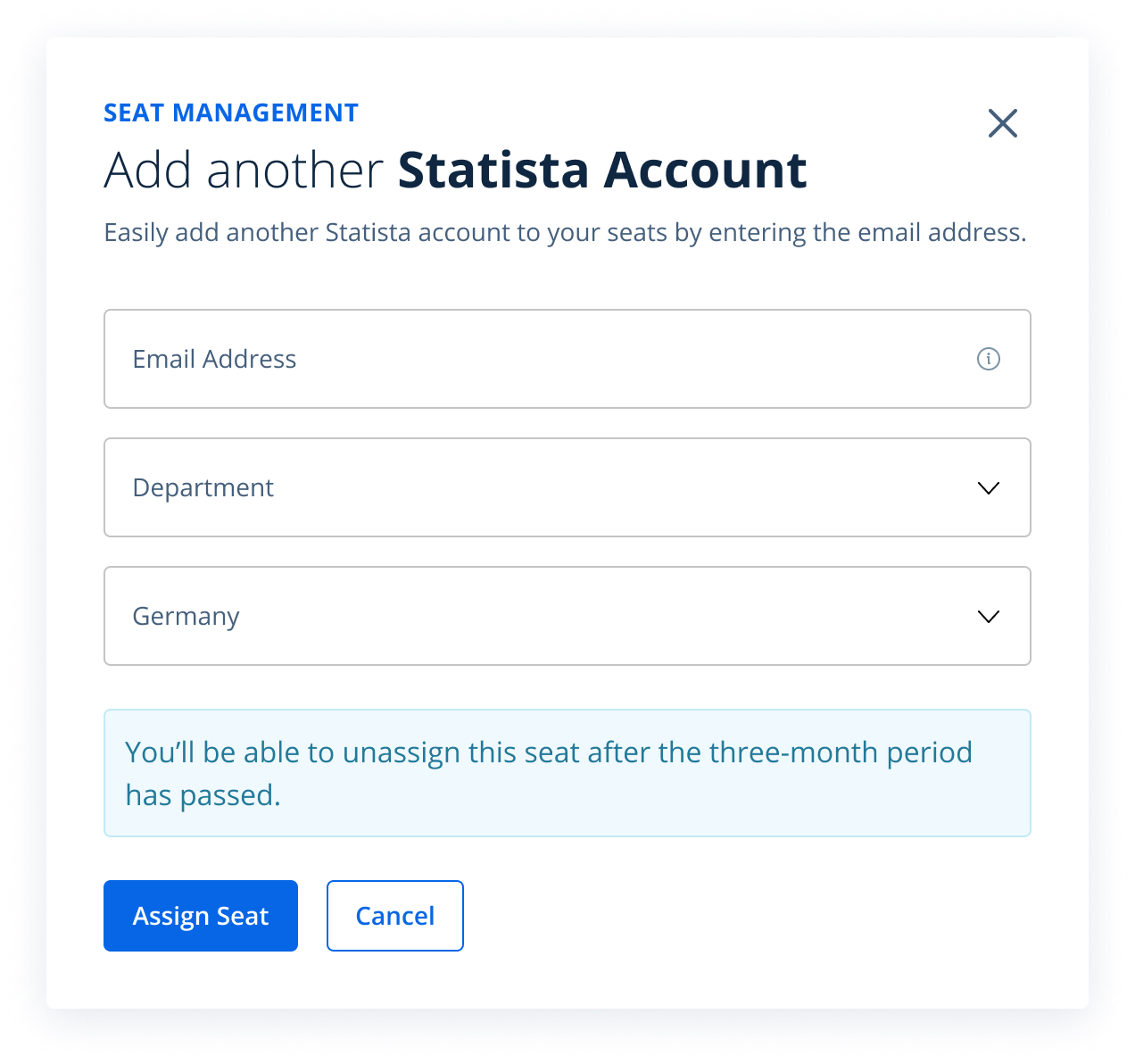 Email address (Note: You can only assign a seat to users who already have a Statista account) The number of seats you can still assign