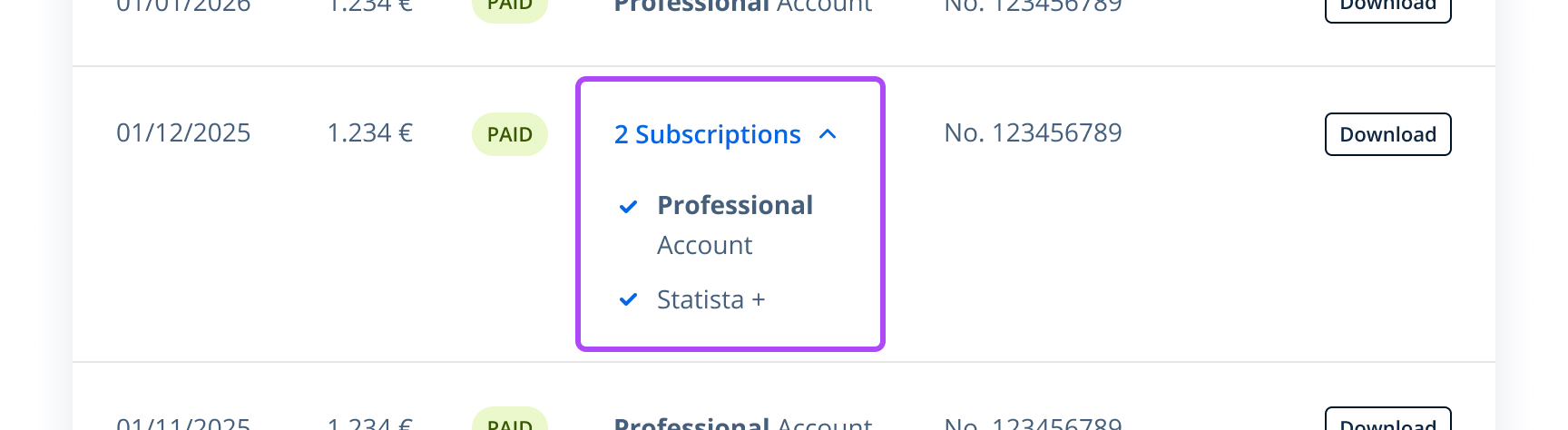 Some invoices may cover multiple subscriptions. If that’s the case, you can expand them in the list to see all associated subscriptions.