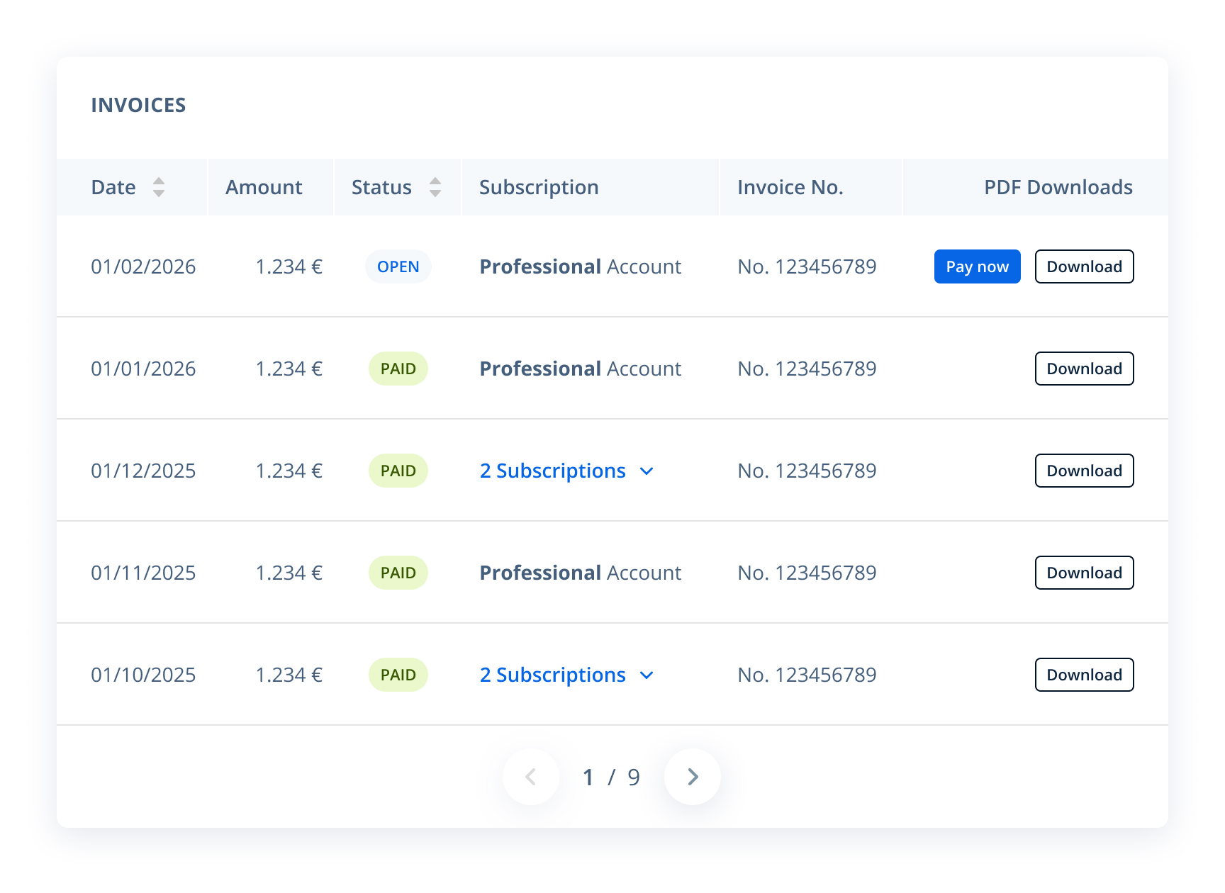 New: With billing management, you now have a clear overview of all your invoices and you can download them directly. It also includes your subscription status and a list of all features associated with your account.