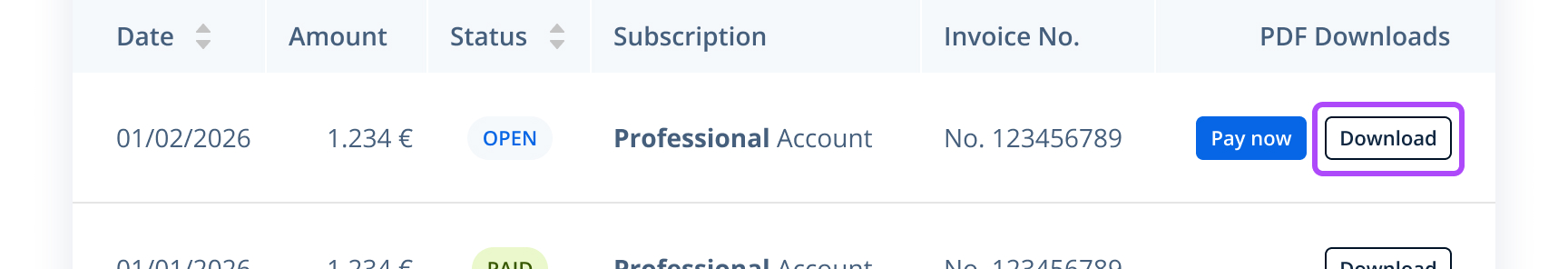 On the right side of the table, you’ll find the Download button, which lets you save your invoice as a PDF.