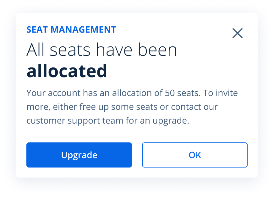 You’ll also find a link to customer support in the pop-up window that appears when you try to add users if all seats are taken. Simply click “Upgrade” in the pop-up, and you’ll be forwarded to our Customer Support team.