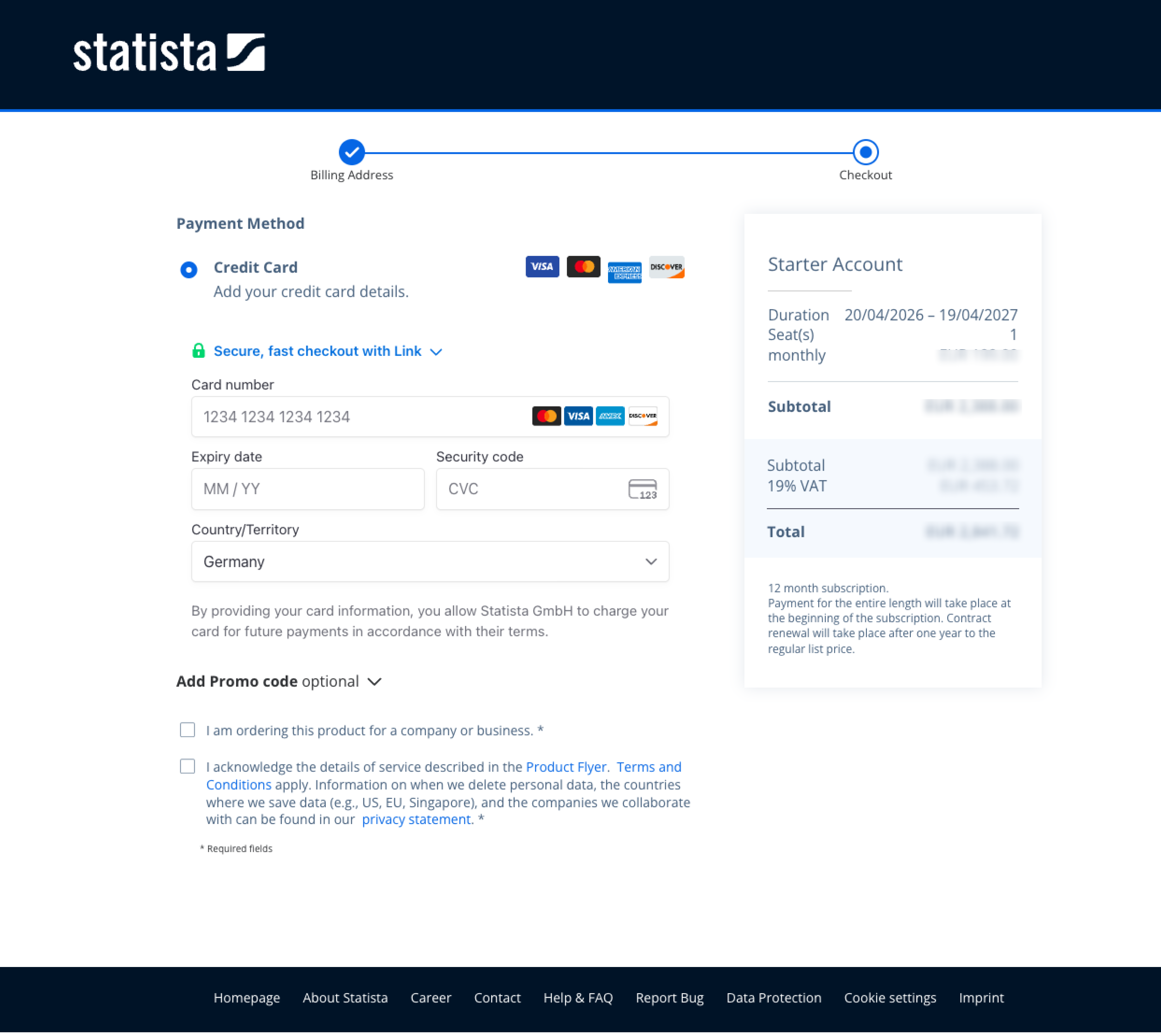 Statista accepts major credit cards, including Visa, American Express, Discover, and Link. You will need to provide your card number, expiration date, and security code.