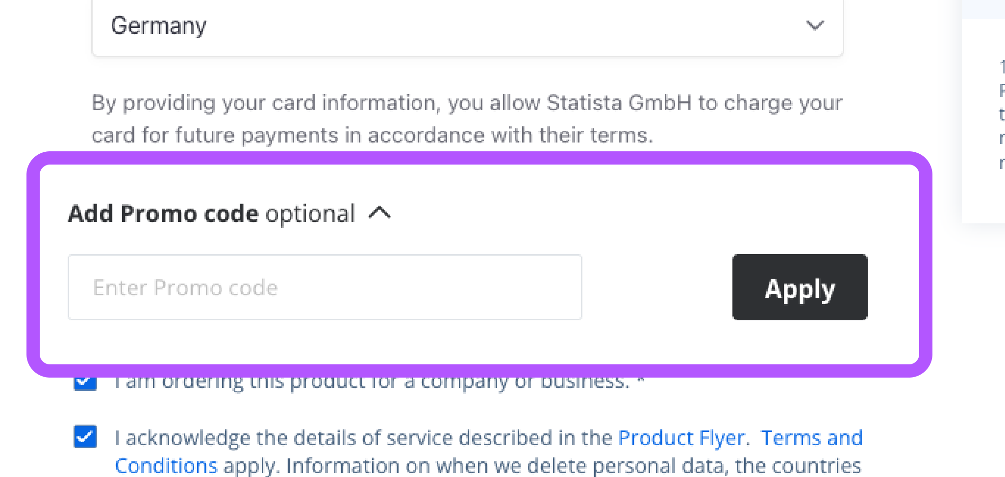 If you have a promo code, please click on the “Add Promo code?” and enter it into the corresponding field. After you click “Apply”, the code validity will be checked automatically.