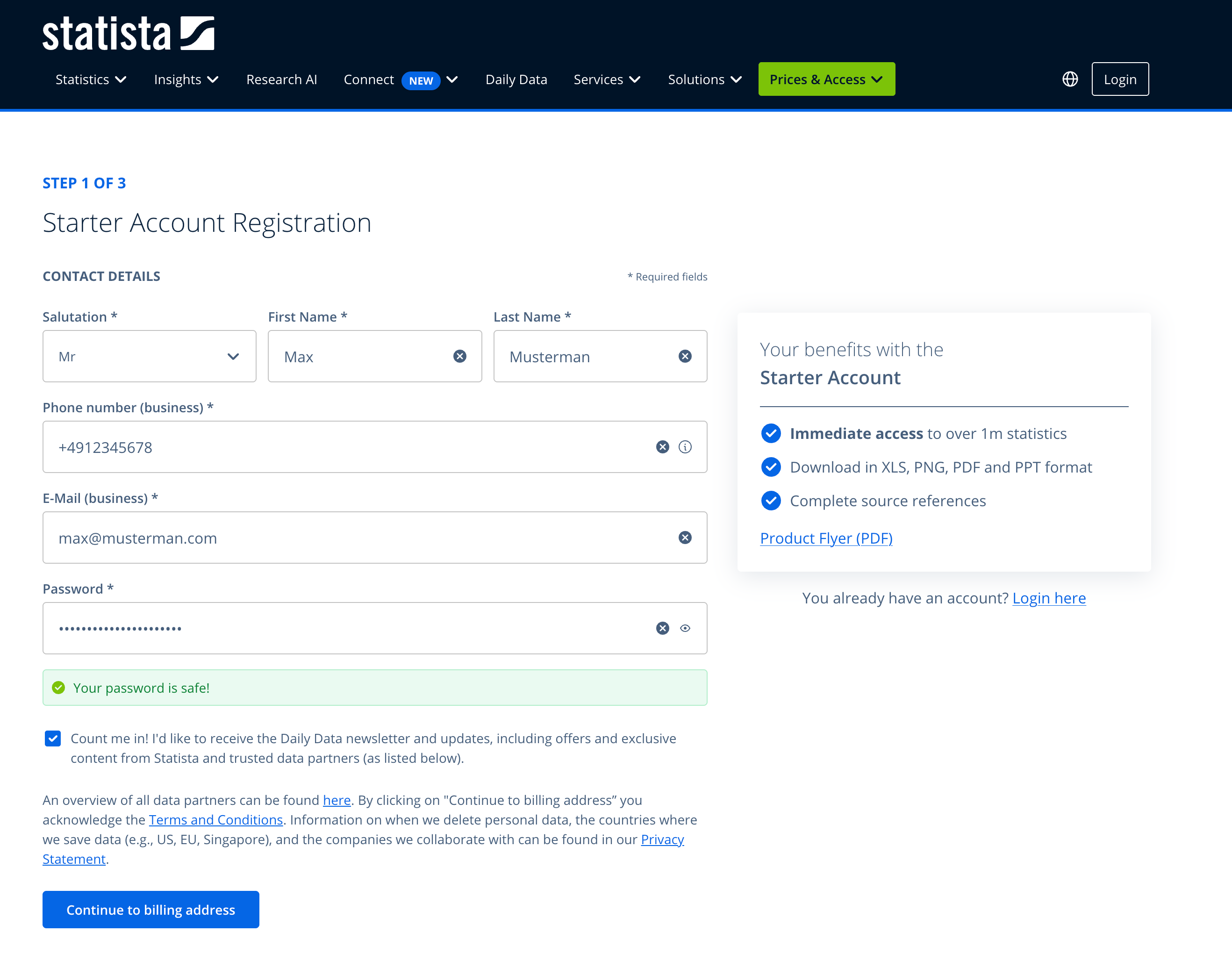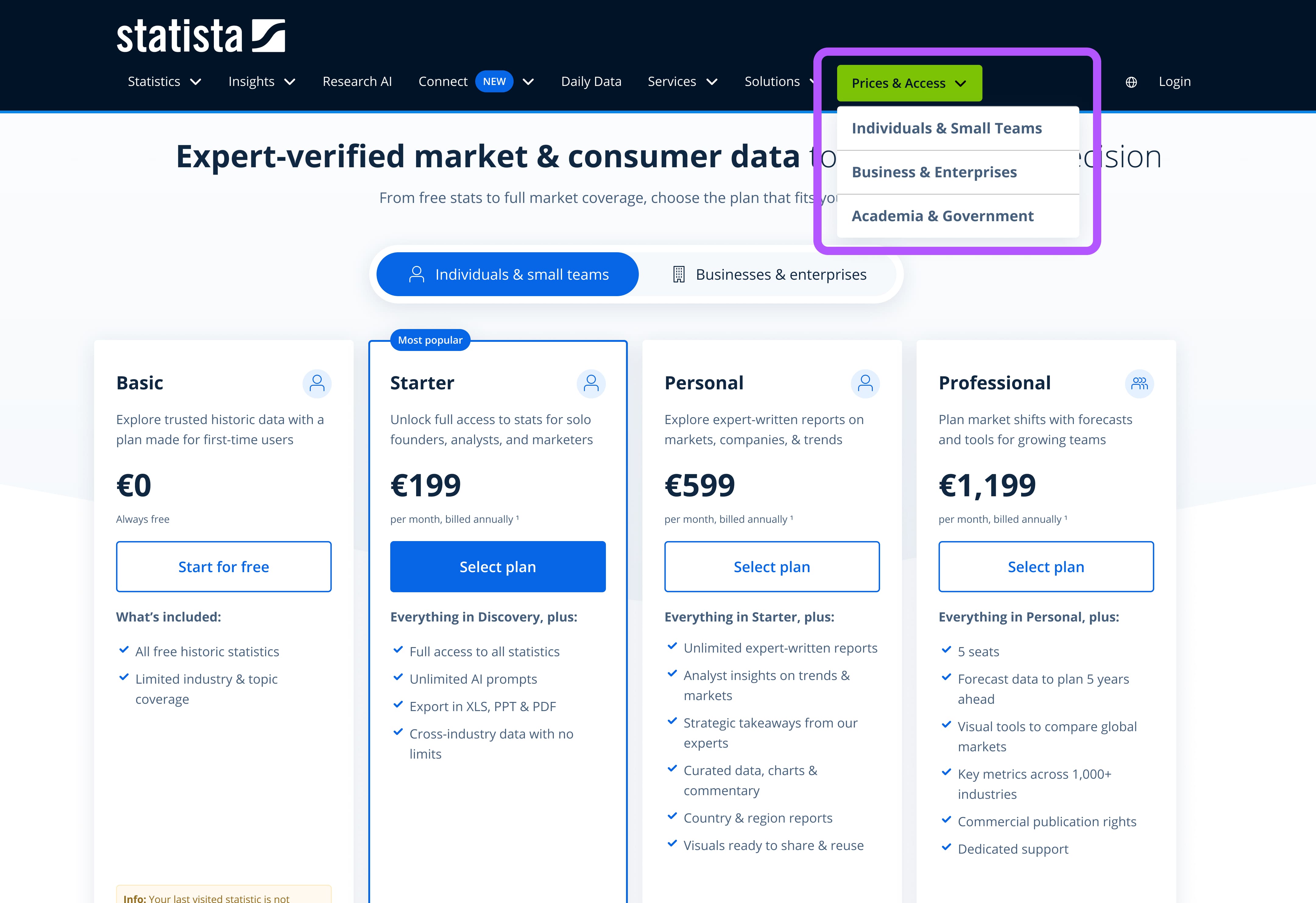 The Starter Account is Statista’s cost-efficient solution designed for solo founders, analysts, and marketers. It provides full access to all statistics, unlimited use of the Research AI tool, all download formats (PNG, PDF, XLS, PPT), and unrestricted cross-industry data.