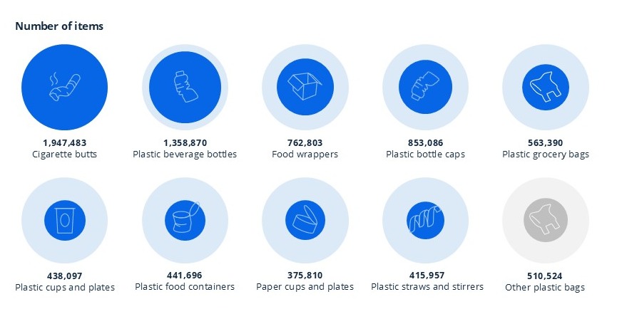 Cigarette butts made up around 1.9 million of the more than 14 million waste items collected on coasts worldwide in 2023. Almost 1.4 million plastic beverage bottles were also picked up.