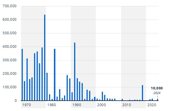 The incident rate of oil spills has dropped significantly since the beginning of the century. The largest leak in recent history was recorded in 1979, adding up to 636,000 metric tons. By way of comparison, the oil leaked from tanker incidents worldwide amounted to about 10,000 metric tons in 2024.