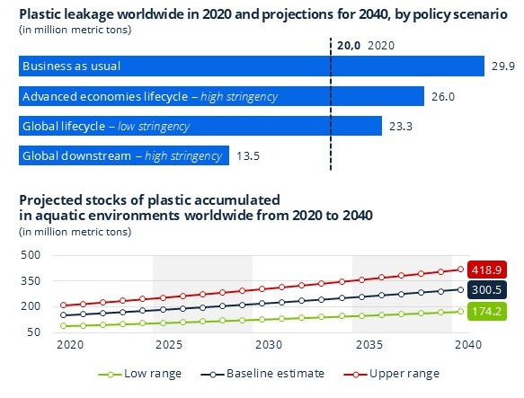 Under a baseline scenario (continuation of current policies), plastic waste generation will rise from 360 metric tons in 2020 to 617 metric tons in 2040, 119 of which being mismanaged waste, and only six percent of plastics used will come from recycled sources in that year.