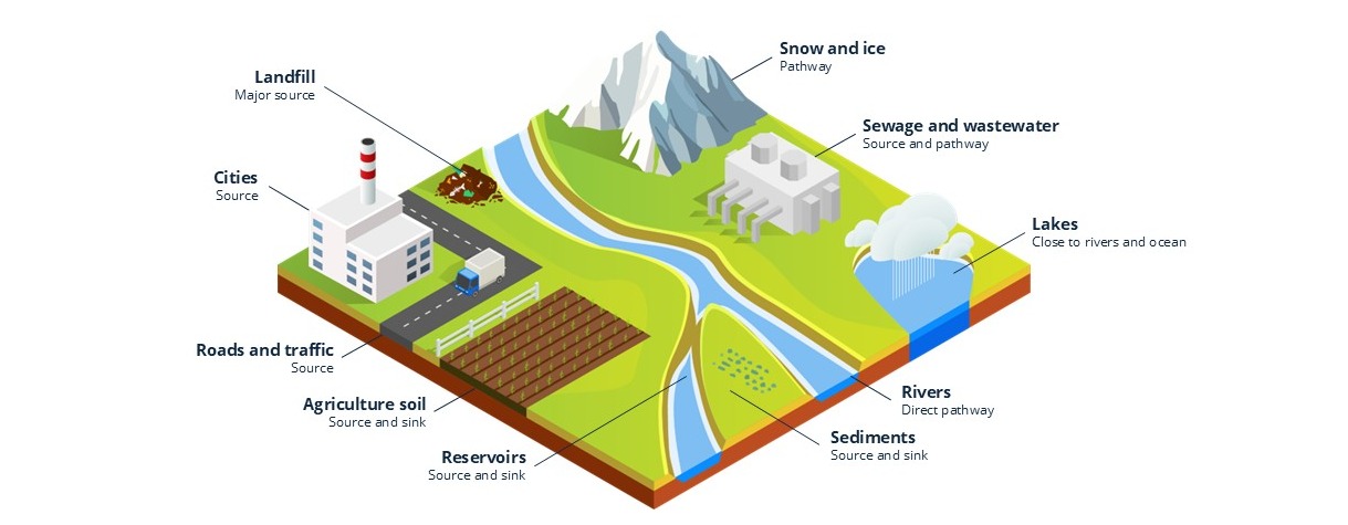 Based on the sources of plastic pollution in oceans, plastic debris can be distinguished as land-based (improper waste disposal, overflow of rivers) and ocean-based (fishing and aquaculture). Due to many countries lacking proper waste management infrastructure, plastic leakage mainly occurs through ocean waterways (page 31). Plastic waste often degrades into smaller particles. As marine life accidentally ingests these smaller pieces of plastic, plastics eventually enter the food chain in a trophic transfer process.